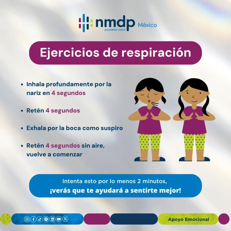 Además del ejercicio físico, tu bienestar emocional y mental también necesitan atención. En NMDP México® contamos con el Centro de Apoyo a Pacientes, a través del cual puedes obtener herramientas de contención emocional, sesiones personalizadas y material informativo gratuito (como nuestro Glosario: Programa de Apoyo Emocional o nuestra Guía: El Camino al Trasplante de Células Madre). También puedes participar en el Programa de Apoyo Emocional para pacientes y cuidadores. Contáctanos y resolveremos cualquier duda que tengas. Estamos aquí para ayudarte.