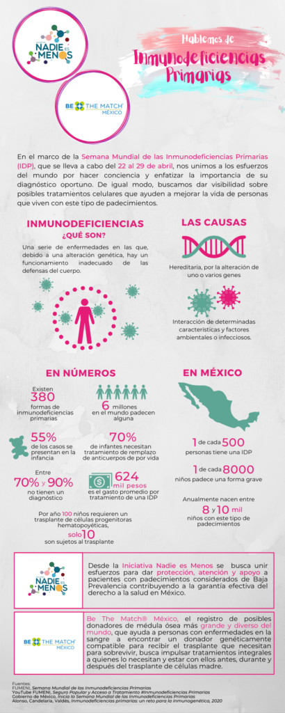 - Cada año, durante la última semana de abril, se conmemora la semana mundial de las Inmunodeficiencias Primarias (IDP), de las cuales, en México 1 de cada 500 personas padece alguna y cada año nacen entre 8 mil y 10 mil niños con este tipo de padecimientos.